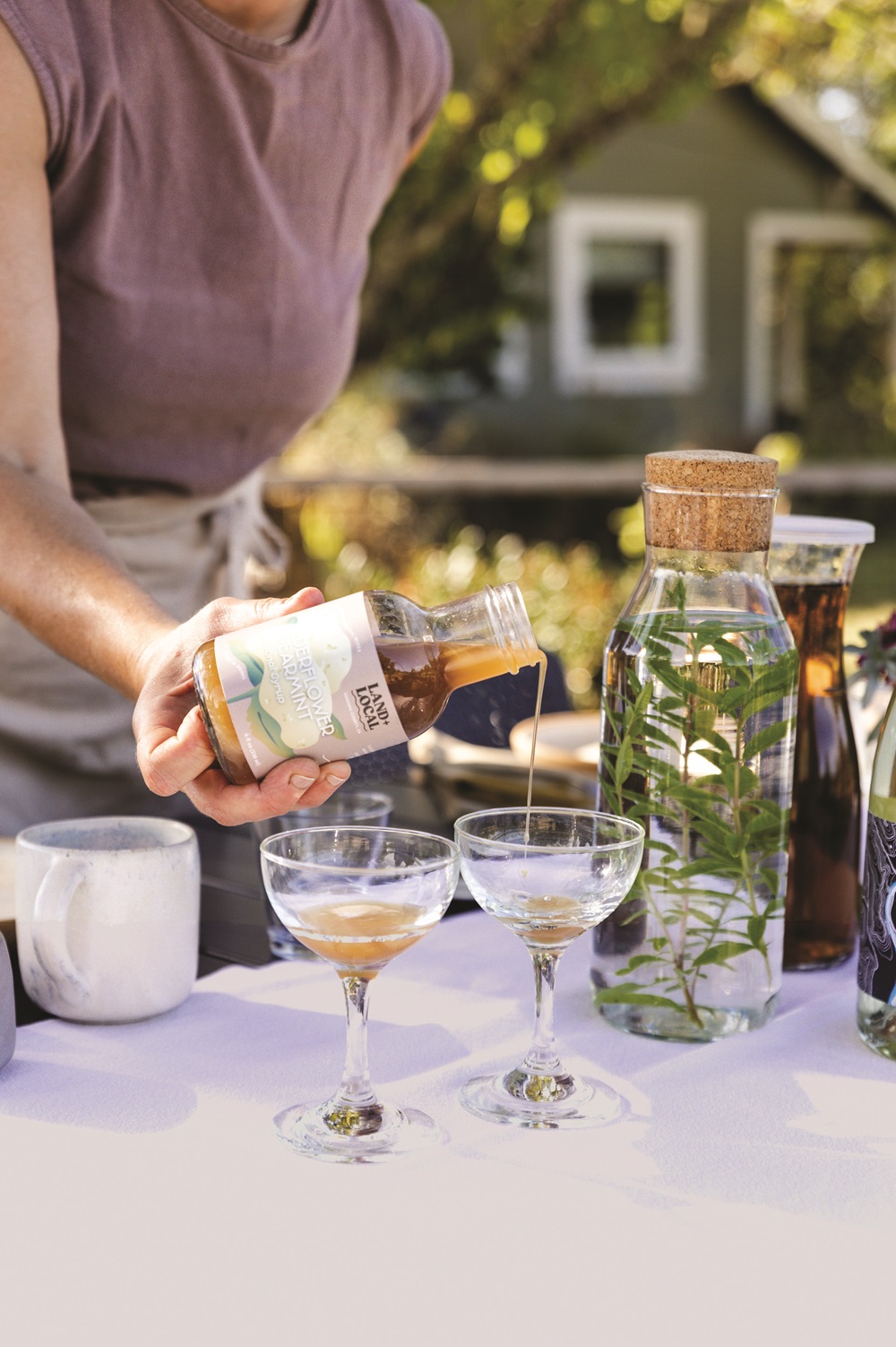 To make an easy nonalcoholic cocktail, coat the rim of a champagne coupe with Land + Local Sweet Lime + Smoke Chili Cocktail Salt, add a dash of Land + Local Rose Cardamom Meyer Lemon Seasonal Syrup to the bottom of the glass, and fill to the top with grapefruit sparkling water. Finish with a fresh sprig of lemon verbena on top. (Use any herb you have growing fresh.)