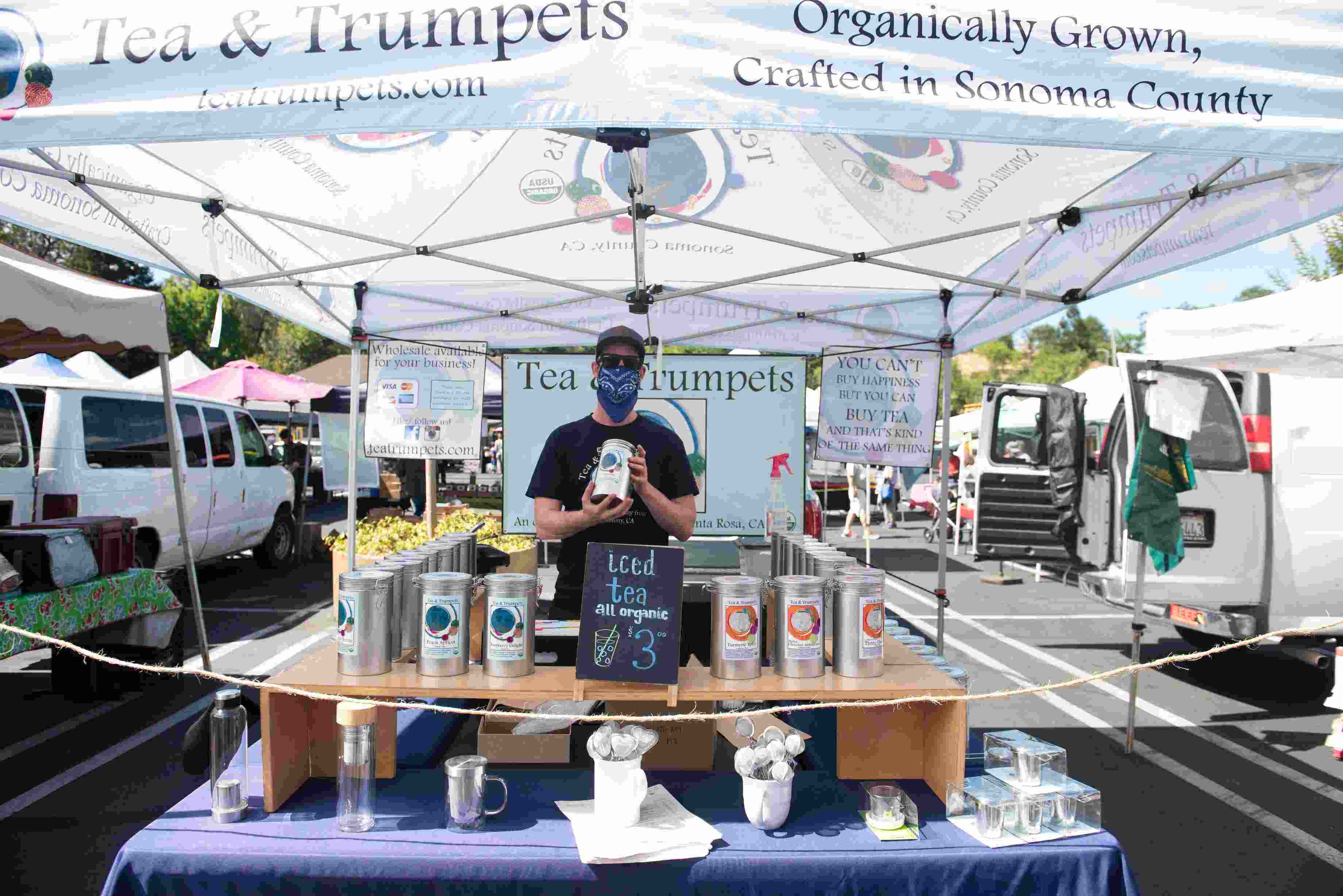 On a recent sunny Saturday, I visit Mark Bowden, owner and creator of Tea and Trumpets Tea Company, at the Santa Rosa Community Farmers’ Market location on Farmers Lane. I ask if he ever gets tired of the furtive half glances from people who awkwardly pass his stall for another. “Nah,” he says, “totally used to it. You get to know who your people are.” On cue, two school-age boys walk up to Bowden’s stall with purpose—one in a full ninja suit that makes his mask look cool. “Are these your people?” I ask jokingly. Without hesitation he goes, “Yes. Yes they are,” and then proceeds to serve up two iced almond rooibos teas for his loyal customers.