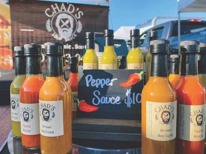 Chad moved to Sonoma County a couple of years ago for love, to be with Samantha, an old high school pal and travel companion turned fiancée. He started growing his hair, his beard, and in the garden, everything from pomegranates and potatoes to 12 different kinds of peppers, including jalapeno, habanero, ghost, and scorpion—all of which find their way into various hot sauces with names like Brown Recluse, Peaches and Scream, and Orange Crush.
