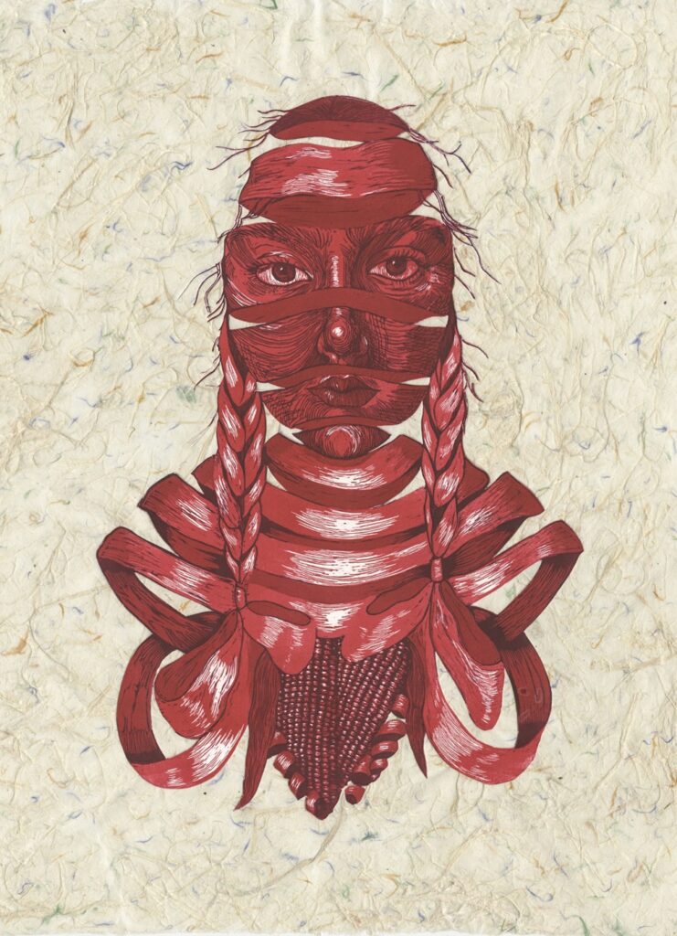 AL: Right now, I am making new prints! I am working larger on 18″x24” linoleum relief prints, exploring textures and, of course, self portraiture. I’m interested in the idea of transformation, and in these pieces, we will see the figures’ skin transform into different materials like lace, crochet, plants and maybe even water.