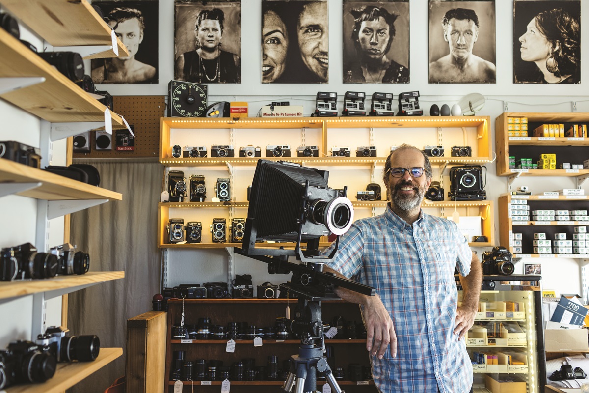Although some, including his accountant, were openly incredulous when Jeremiah decided to hang his shingle on the photo corner 14 years ago, his regular customers get it, considering the spot a touchstone for the local photographic community. Long-time friend and employee Andie Thornton tells me, “You can get a used camera anywhere if you really want to, but people come here because Jeremiah makes them feel special and cared for. It’s just a messy-ass camera store, but people love him.” She thinks this is the fundamental element that makes his tintypes so stunning.