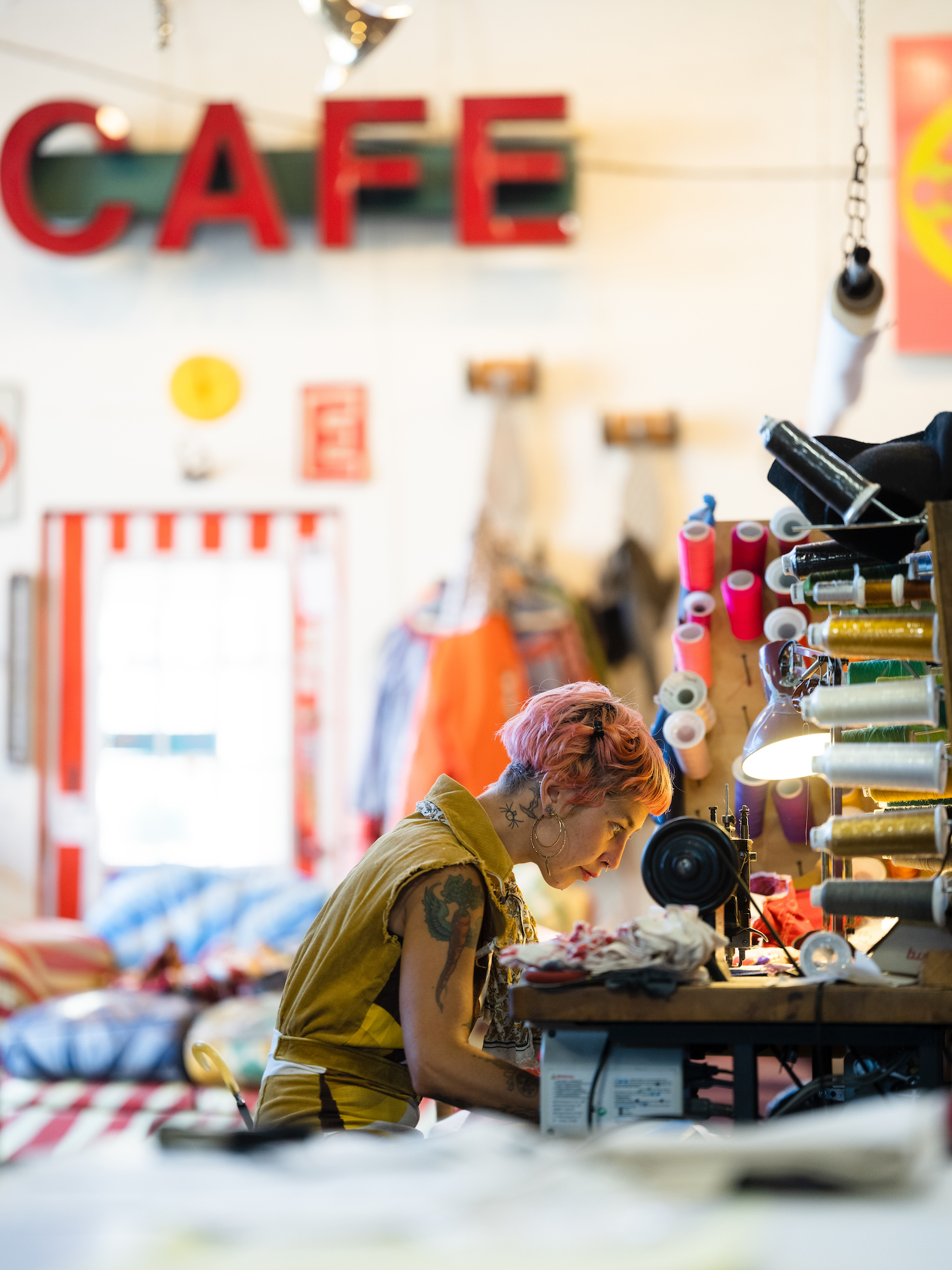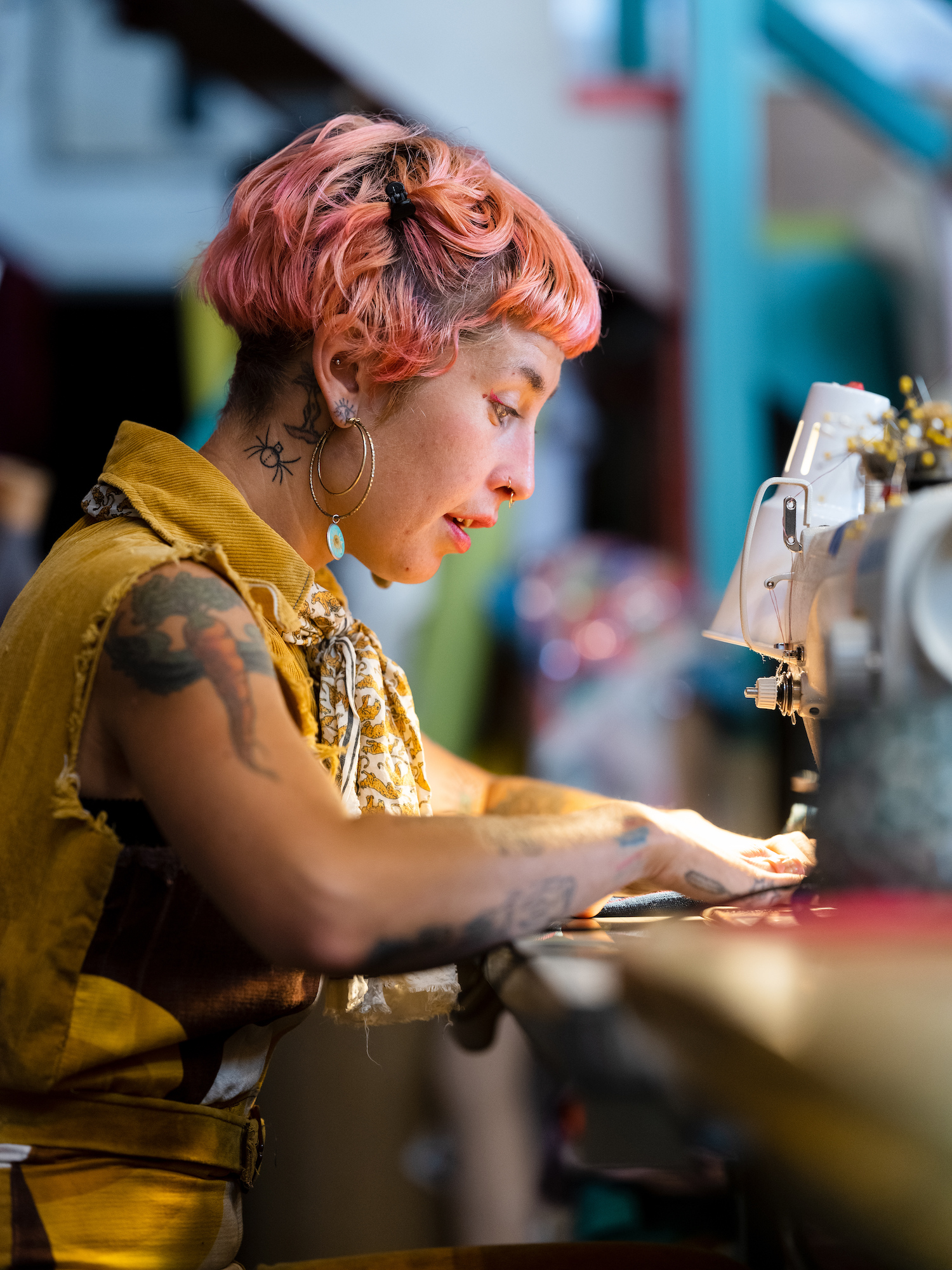 “I didn’t do sewing school or formal education, so we wing it,” she tells me. “I make things that I wish I had; I wish there were more bright, colorful, fun clothes available, so that’s what I make. The fabric inspires the thing. I don’t think about it ahead of time.” The result is brilliant cohesive chaos.