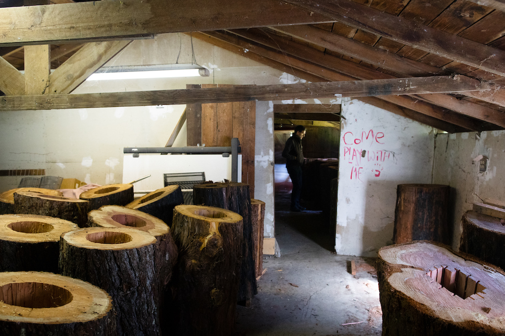 Thiele manufactures arboreal nests of his own design out of logs, a vast departure from the Langstroth boxes which he contextualizes as reflective of the industrial revolution, “a time when everything was understood to be mechanized. Agency and sentience had been outlawed in the world beyond the human. But now in the 21st century, conditions are radically different. The scientific community is acknowledging that nature has agency and to some degree sentience — a complete paradigm shift.”