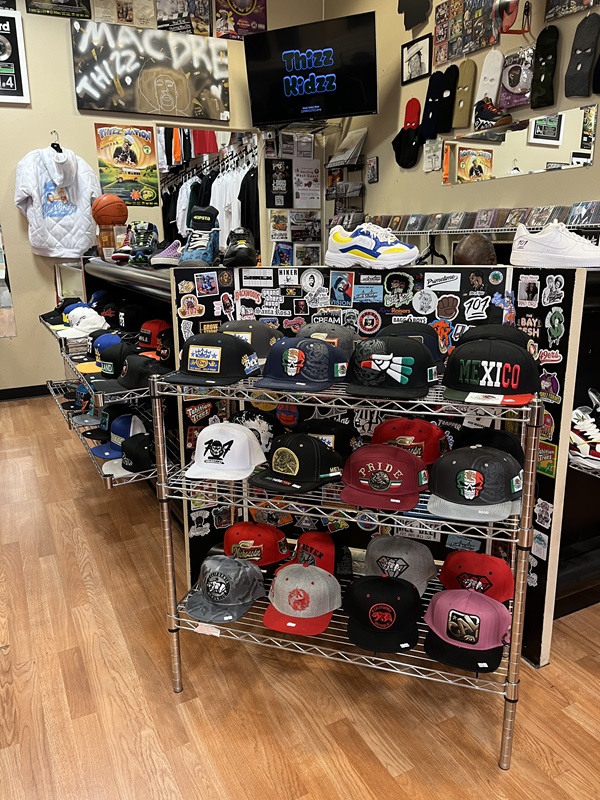Myk sells all manner of snapback hats, beanies, sneakers, shirts, hoodies, pants, decals, posters, and other accessories. He also makes custom prints—any design on any garment—and rents the studio for $50 an hour. There’s a basketball hoop, and for every $100 spent on merch, customers have a chance of winning a pair of free sneakers by making a shot from the shoe line.