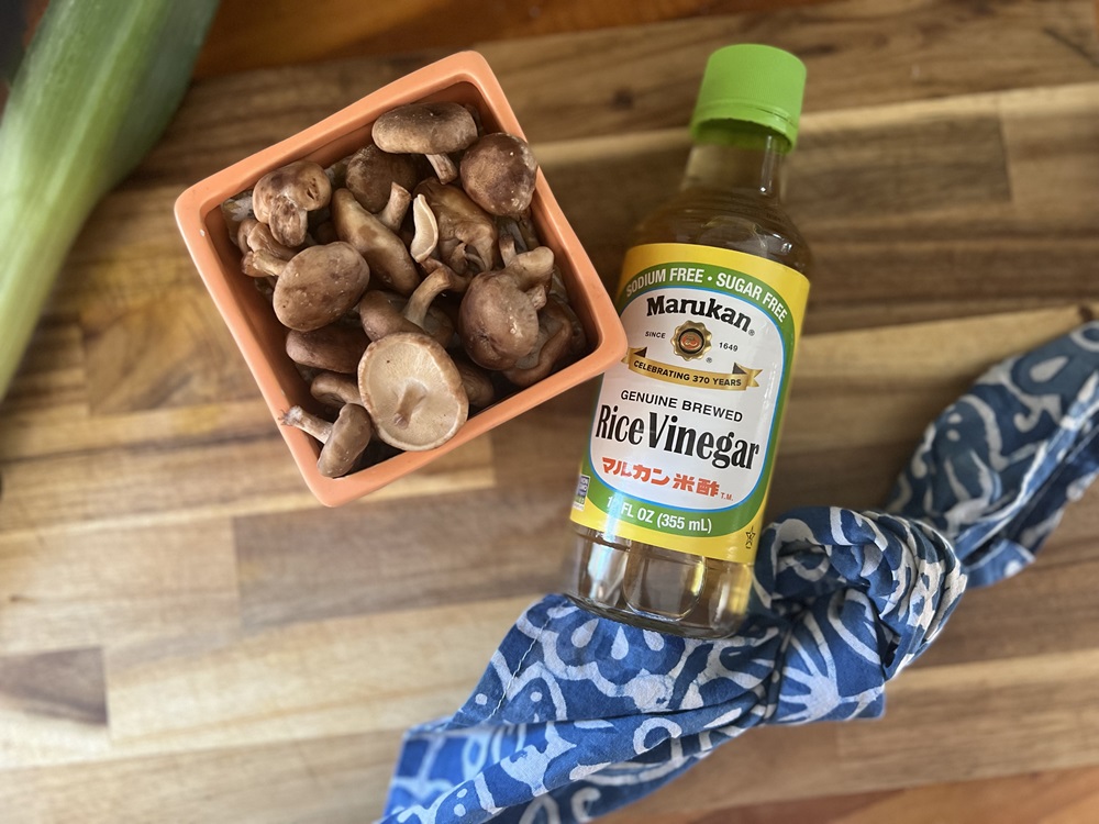 Vinegar can preserve the essence and flavor of mushrooms quite nicely. This recipe lends itself to making seasoned rice for homemade sushi and onigiri. Mushroom growers are becoming more common, with various offerings at farmers’ markets and grocery stores. My favorites are shitake, maitake, and lion’s mane; however, any edible mushroom will do.