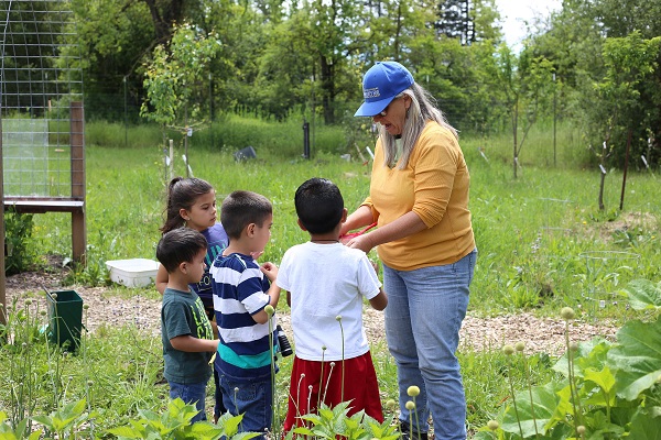 CSF’s school garden educator Nancy Johnson provides “learn by doing” instruction and nature experiences to about 350 elementary students a week, who walk over from the neighboring campus with their teachers. Johnson teaches them about plant structure, germination, pollination, and seed spreading. They get lessons on caring for plants through seasonal cycles and harvest, and they prepare simple recipes like Rainbow Salsa in the outdoor kitchen area. Students also keep nature journals and take walks in the oak woodland, learning to identify birds and other wildlife. The age- and grade level appropriate curriculum ties into California Common Core standards. “The farm beds that produce organic produce, California native plant habitat gardens, and adjacent oak forest provide endless teachable moments, every day and season of the school years,” says Johnson.