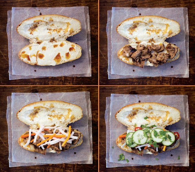 You can feature practically anything in a banh mi and it’ll taste fabulous. Just remember its framework of crisp bread, a succulent filling, pickled vegetables, chile slices, cucumber, and fresh herbs. The best bread for banh mi feels light, has a thin crust, possesses a cottony interior, tastes faintly sweet, and is often considered commonplace. Be generous with the fat to avoid dry results. And don’t overstuff with protein. A balanced banh mi resembles a salad in a sandwich: The visual ratio of main filling to vegetables should be 1:1 or 1:2. Customize your sandwich via this outline.