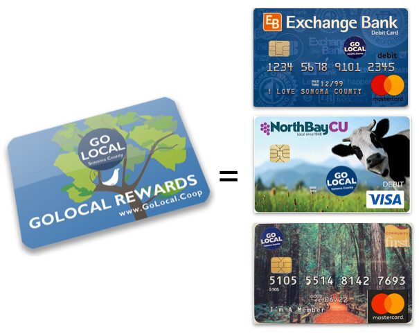 If you already have a debit or credit card with Community First Credit Union, North Bay Credit Union, or Exchange Bank, you can get a sticker at a branch to add to your card, to use it as a GO LOCAL Rewards Card – for one less card in your wallet!