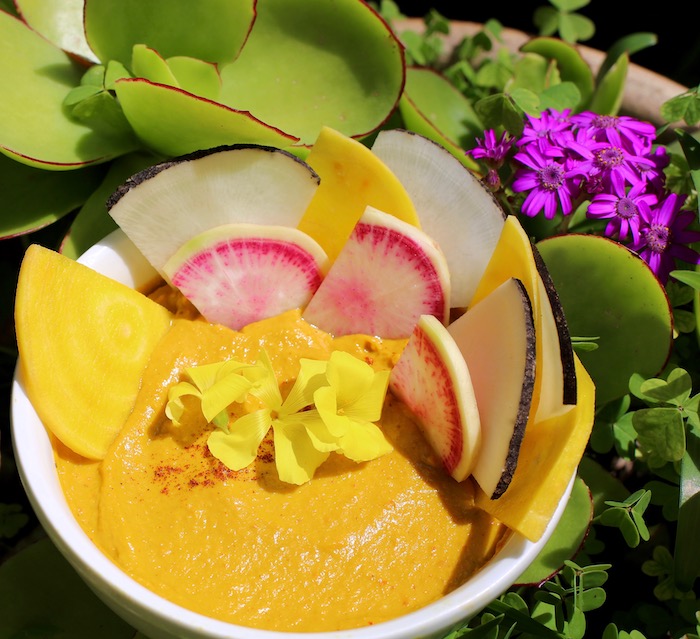 Serve this dip with fresh vegetable chips made from Asian radishes (like daikon), or golden beets.