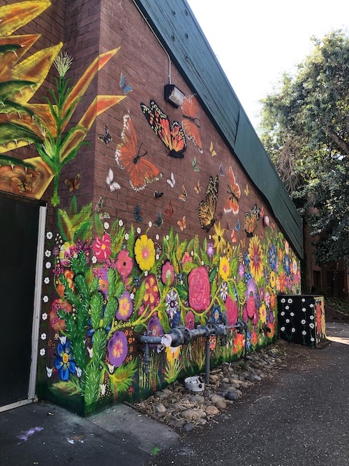 On a mild morning in July, she has also become an artist, painting large bright blue flowers on the giant brick wall of Third Street Aleworks in downtown Santa Rosa. Garcia is one of twelve women who planned, designed and executed this mural, called Harvesting Hope After the Fires, which pays tribute to the essential and invisible workers who don’t stop working when most everyone else does.