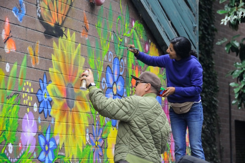The mural is comprised of workers from three fields—cleaning, construction, and agriculture—created by Zuniga from photos of actual people and painted amid a riot of bright flowers, vines, and butterflies. On their final day of painting, Zuniga tells me, many of the women spontaneously filled blank spaces with more and more color, sometimes tweaking his designs to better suite their own vision. Unsteadily at first, and then with more confidence, they stabilized ladders and climbed higher and higher up the wall.