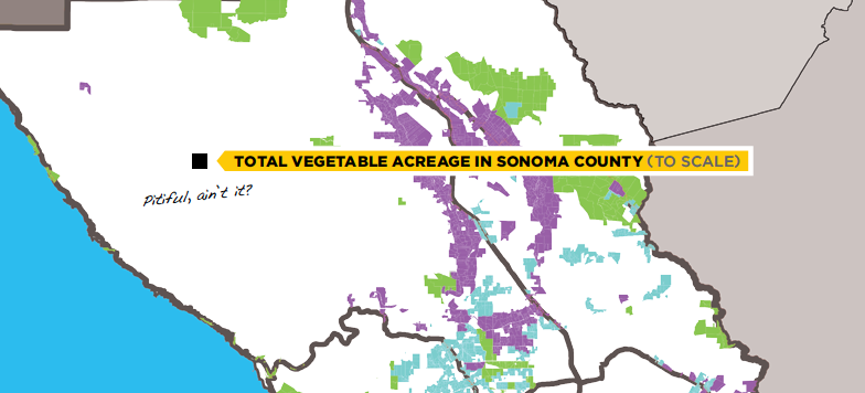 Sonoma County doesn’t produce much in the way of vegetables. In 2015, roughly 512 acres of vegetable production yielded $12 million. Not much, given that yearly we consume several hundred million dollars’ worth of the stuff. So, what gives?