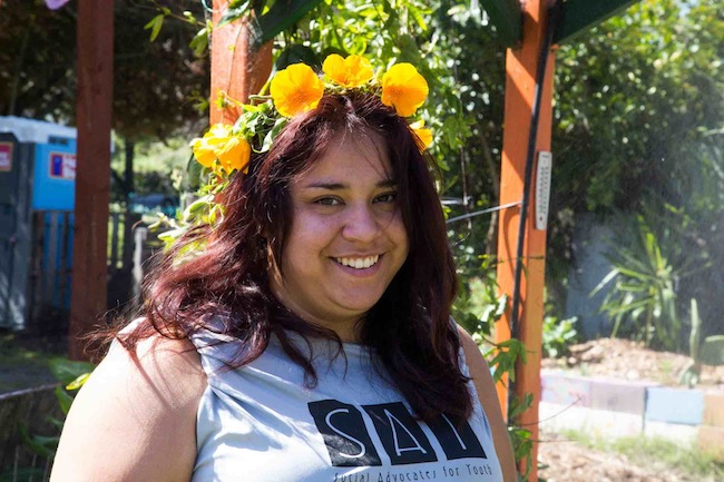 was able to find housing at Social Advocates for Youth (SAY) Dream Center, which provides emergency short-term shelter for young adults between the ages of 18 and 24. SAY also set Mahony up with a job at their Sunflower Community Garden, a working urban farm and part of the nonprofit’s job skills program. The work has given Mahony a sense of family and purpose at a time in her life she needed both.