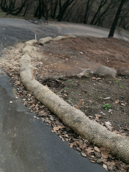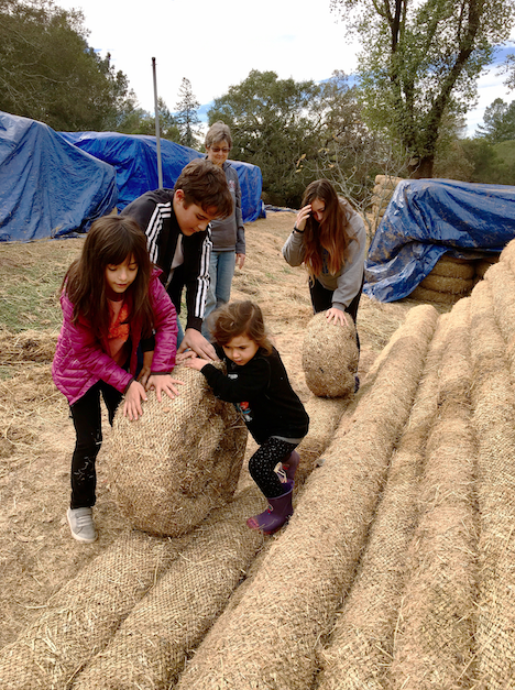 That same week, Cadden was forwarded an email from the Sonoma Ecology Center with information about a coordinated emergency effort to provided free rice straw wattles for watershed protection. Used to create a perimeter around debris fields, the wattles contain the ash before it can enter waterways. Cadden contacted Chris Grabill, a local contractor and member of the hastily convened Watershed Task Force. Soon, a truck arrived with eight heavy, snake-like wattles.